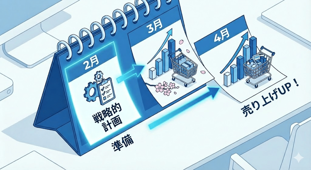次の需要期(新生活・春商戦など)を見据えた商品選定を完了させることが重要です。