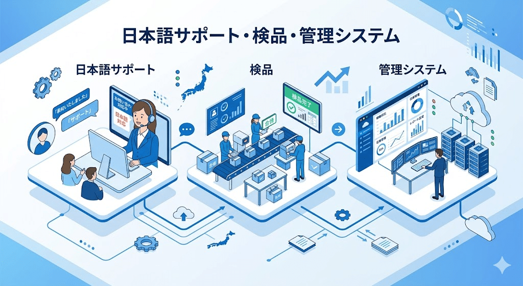 独自の管理システム:発注から配送状況までを一括管理できるシステムを提供しています。不透明になりがちな中国輸入のプロセスを可視化し、効率 的な運用をサポートします。