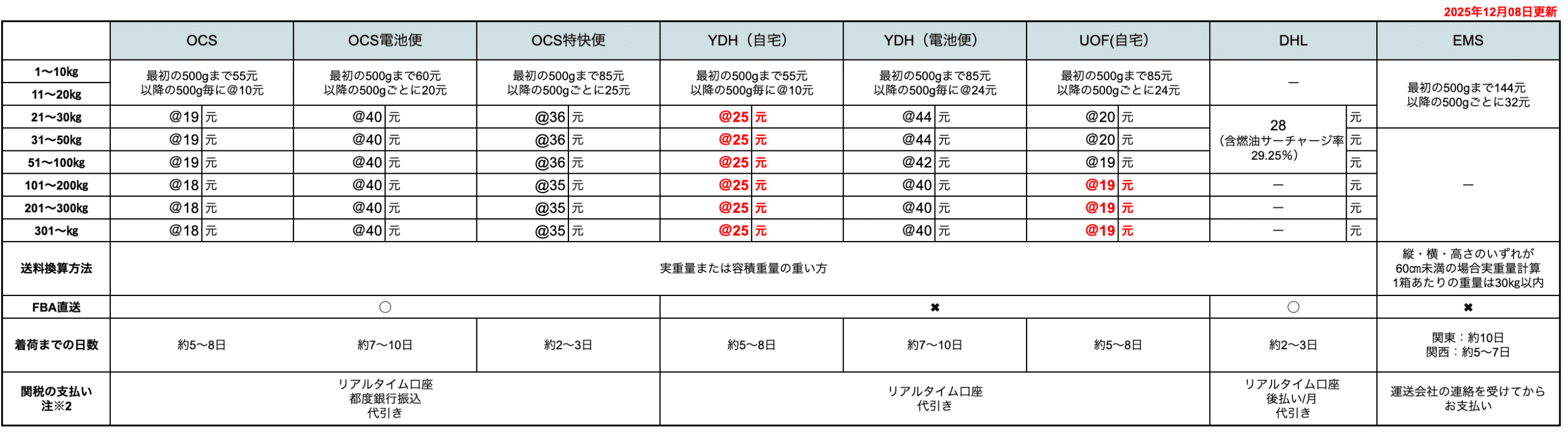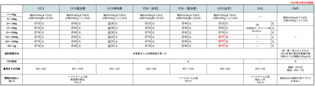 電池など容量の小さいもの(UOF快速船便)の場合は、送料が料金表+5元/kgとなります。
